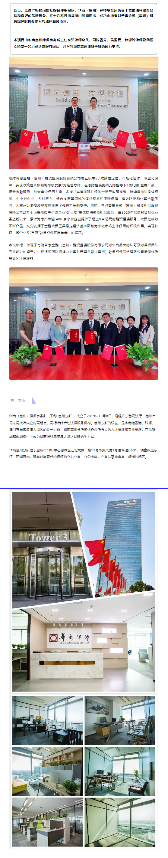 惠州分所中标粤财普惠金融(惠州)融资担保股份有限公司法律服务项目 2023-04-26 列表 上一篇 华商律师受聘担任上市公司东莞铭普光磁股份有限公司常年法律顾问 华商高级合伙人陈妙财律师团队受聘担任英大证券有限责任公司常年法律顾问 下一篇