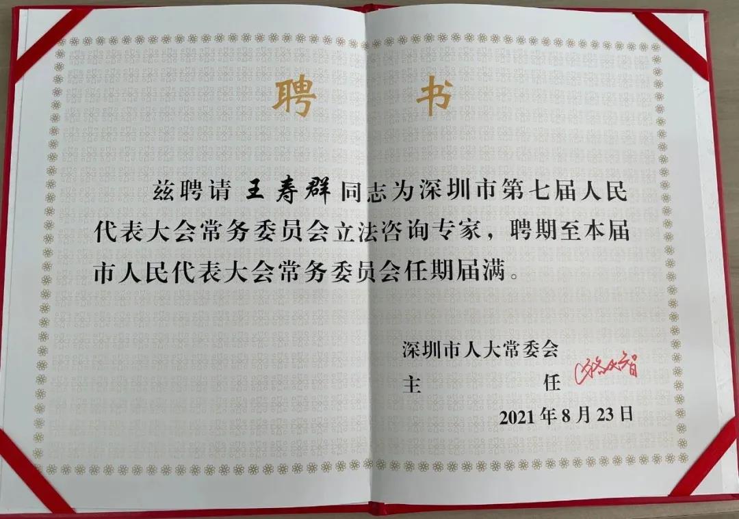 王寿群律师受聘为深圳市第七届人大常委会立法咨询专家