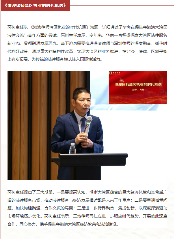 华商律所将把握新的历史机遇,积极引进港澳律师到总分所、联营所执业,为港澳律师创造良好的发展条件。作为大湾区的重要一份子,华商将主动融入时代发展新途,立足行业,与社会各界携手并进,为推动大湾区法律事业互通共融贡献力量。