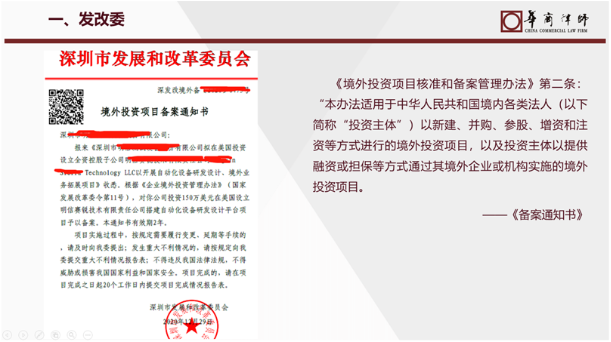 随后,齐梦林律师详细分析了ODI需要办理的相关手续,分别是由发改委出具《境外投资项目备案通知书》、由商务部门出具《企业境外投资证书》、在外管局或银行办理外汇登记。发改部门和商务部门的核准或备案程序为外汇登记、资金汇出的前置条件。