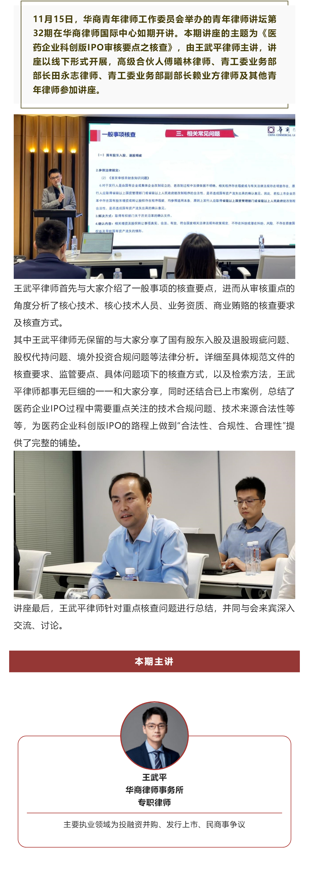 “华商青年律师讲坛”第32期:医药企业科创版IPO审核要点之核查 2022-11-17 列表 上一篇 华商不良资产法律专业委员会与金融法律专业委员会举办业务打通整合工作会议 高级合伙人袁韶浦律师受邀参加深圳市第四期知识产权政策解读专题培训并做《深圳市知识产权保护和运用“十四五”规划》内容解读 下一篇