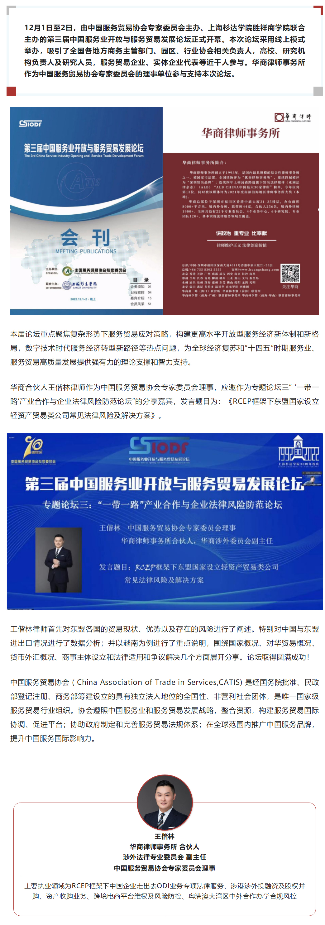 合伙人王偕林律师受邀参加第三届中国服务业开放与服务贸易发展论坛并作主题分享 2022-12-05 列表 上一篇 首届“华商杯”诗词散文大赛进入评审环节 踔厉奋发,共建百年华商!新晋合伙人风采展示 下一篇