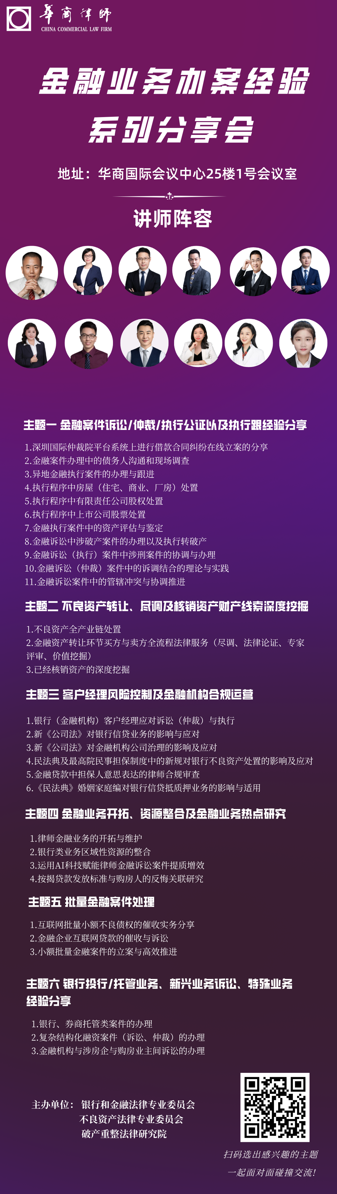 为充分整合华商金融法律服务资源,为客户提供标准化、专业化且高端的金融法律服务,在竞争激烈的金融法律市场中彰显华商金融法律服务品牌特色,加强本所同事之间金融业务办案经验交流,金融委将联合不良委、破产重整法律研究院每两周选取两个子主题举办金融业务办案经验分享会。以下为拟分享主题,欢迎大家扫码选出感兴趣的主题与我们一起面对面碰撞交流,更期待您能积极参与,与我们共同分享、交流您的金融业务办案经验。